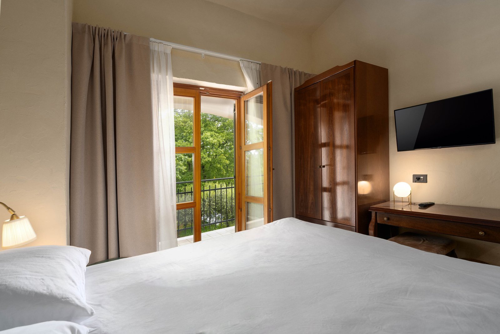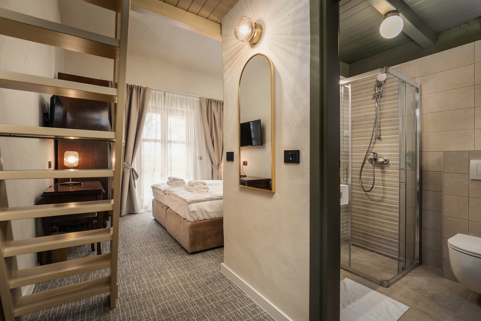 Modernly decorated with pastel walls and soft carpets, the room is spacious and bright thanks to floor-to-ceiling windows. The bathroom, equipped with the latest sanitary ware, offers a spacious shower cabin for relaxation. Spend your morning enjoying the spacious balcony with views of the surroundings or refresh yourself in the upcoming outdoor pool.